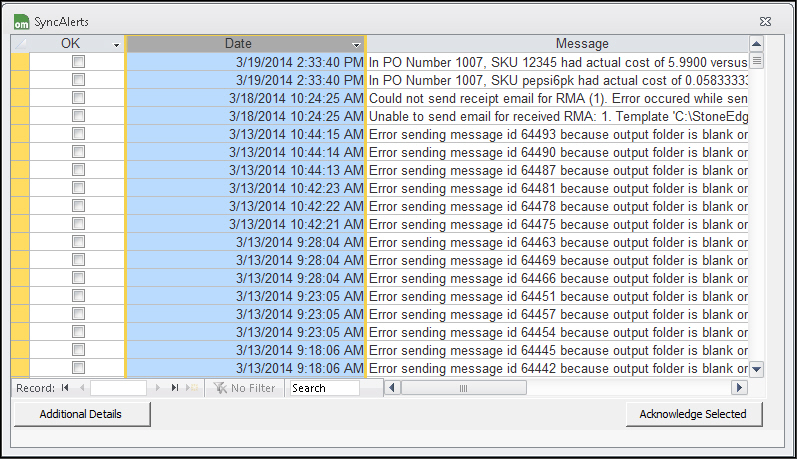 When the issue is resolved, select OK of the selected alert and then Acknowledge Selected to remove the alert from the display at this screen. The Alert still remains in the database table.