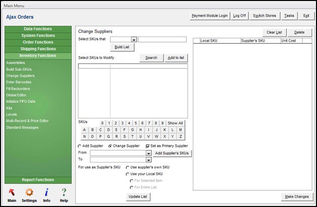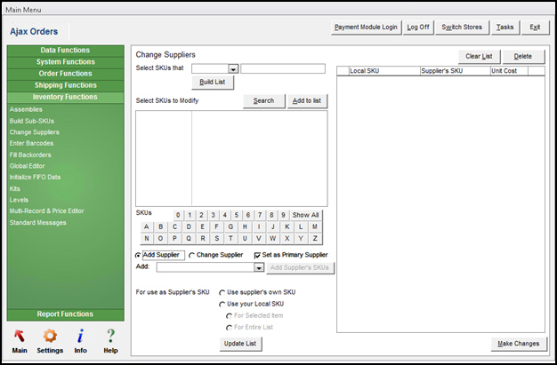 The Change Suppliers screen is used to add or alter existing supplier record(s) associated with inventory items. When making any mass changes, it is advisable to backup the store data file first.