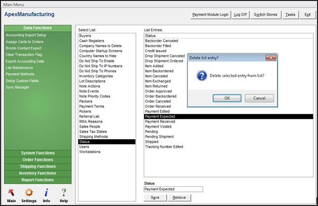 Select the status to delete in List Entries. The figure below shows that status label "Payment Expected", which was added in the previous example, will be deleted.