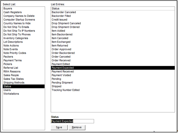 To add a new entry to the list of acceptable order statuses, select in the text field labeled Status, at the bottom of the screen, and type in the desired value. The figure below shows "Payment Expected" will be added. Notice in List Entries that the status does not currently exist.