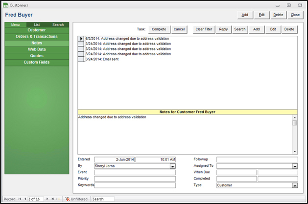This topic describes the Notes tab the Customers Accordion Menu. Notes and tasks are basically the same, except tasks can be assigned to specific users and requires the security system to be enabled.