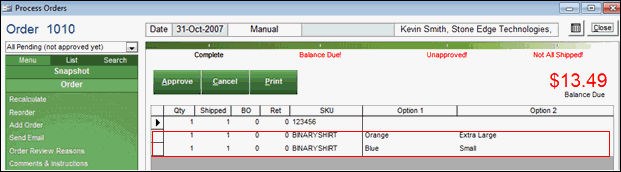 Monsoon Order Manager populates the Option fields of an order record based on the sequence in which it receives attribute data from the shopping cart. There is no correlation between the option or attribute "number" at the shopping cart and the Option (1-10) field numbers in which the product's attribute information is placed in the Monsoon Order Manager order record.