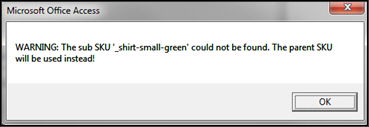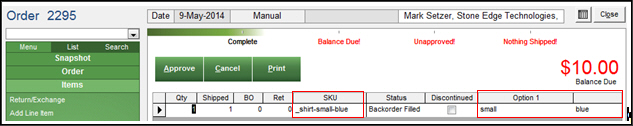 If an attribute is typed into the option drop-down list and the program does not find a match, the user is warned and the parent SKU is added to the SKU field in the order. The options are added to the Option1, Option2,...etc. fields.