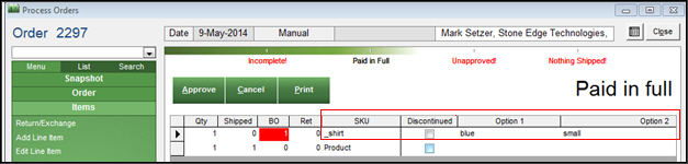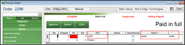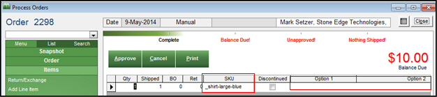 The program matches the ordered item to the existing sub-SKU inventory record and when Add Line Item and Close is selected, the matching sub-SKU is entered into the SKU field on the order and the options are listed in the Option1, Option 2...etc. fields, as shown in the figures below: