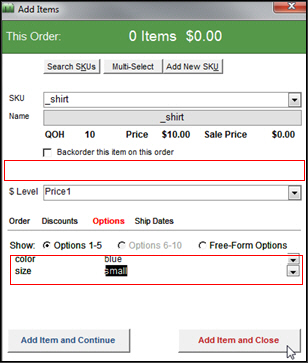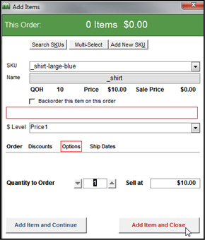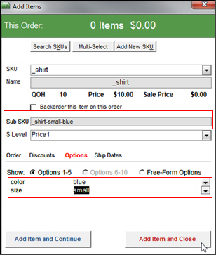Notice there is no sub-SKU field on the Add Items form and the Options tab is not highlighted in red text. The expanded SKU is added to the SKU field in the order and nothing is added to the Option1 and Option2 fields of the order, as shown in the figures below:
