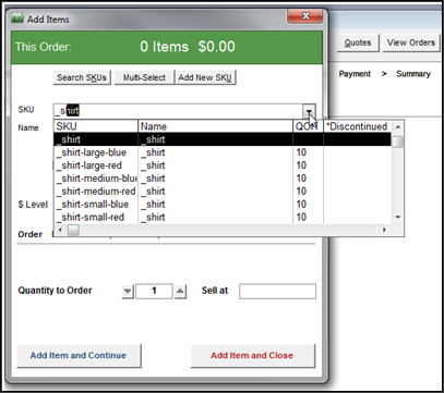 The SKU drop-down list on the Add Items screen contains every SKU expanded to include its attributes (which can be cumbersome to scroll through if you have a large number of items in your inventory).