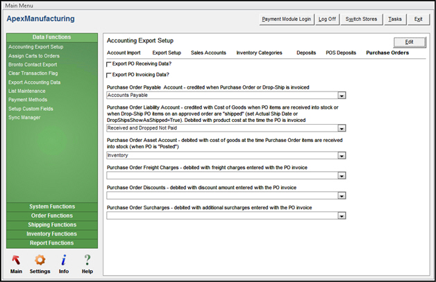 Purchase Order Payable Account - Set this to your "Accounts Payable" account (QuickBooks) or an "Expense" account (text). This will be the account that gets credited when invoicing data is exported.