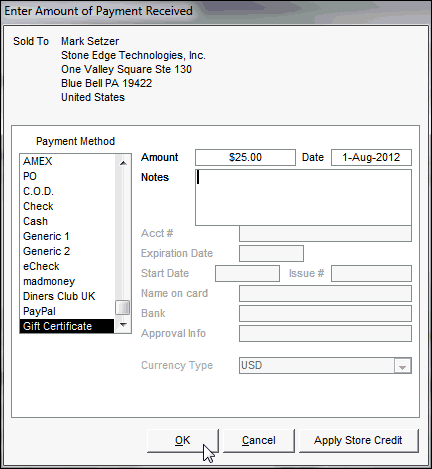 Select the Payment Method of "Gift Certificate" and enter the Amount of the gift certificate to create a payment record to offset the sale.