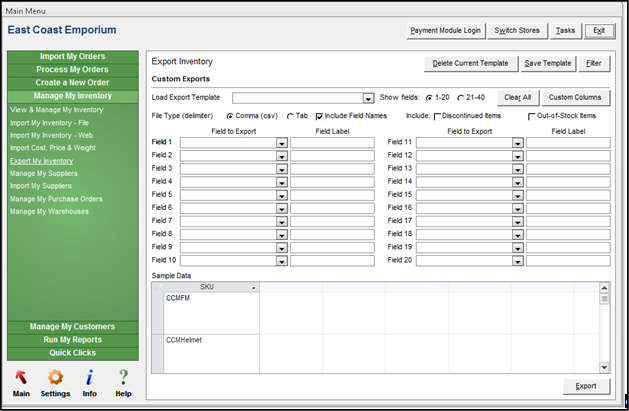 To map the inventory SKU field to Field 1, select the drop-down menu in the Field to Export column of that row and select SKU from the list. As the other fields are mapped, their values will also appear in the Sample Data section of the screen.