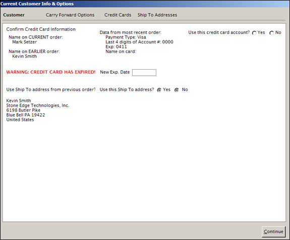 add the new expiration date, and if the most recent credit card and shipping address information is acceptable, choose the Yes radio buttons and select Continue to finish the order; if the No radio buttons are chosen, the program continues to the Manual Orders screen