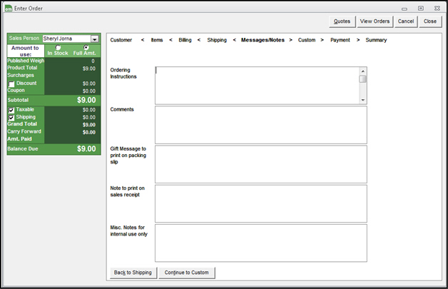 Manual Orders: Messages/Notes screen