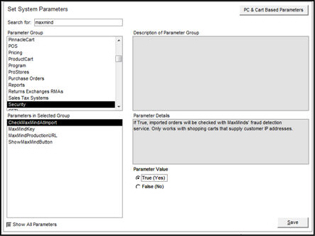 ShowMaxMindButton - If True, a MaxMind button appears on the Customer tab of the Process Orders screen. Select it to get a "fraud score" for the current order. Only works with shopping carts that supply customer IP addresses.