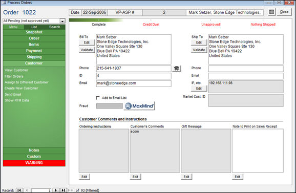 Fraud checking takes place manually at the Customer tab of the Process Orders screen and automatically when importing orders from the internet.