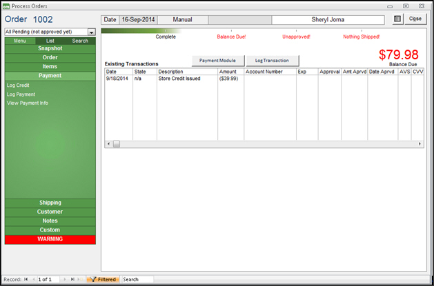 The Payment tab accordion contains the Log Credit, Log Payment,and View Payment Info links.