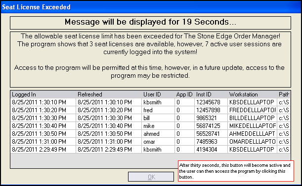 At this time, a message stating the number of licenses and the number of active sessions will remain on the screen for 30 seconds, after which, the program displays OK to allow the user to access the application.