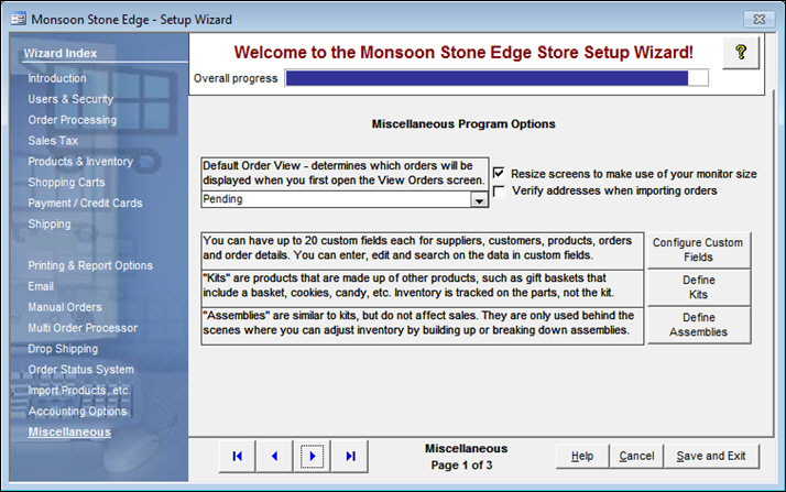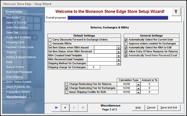The Miscellaneous section of the Store Setup Wizard contains a variety of program settings, such as altering the screen size, verifying addresses upon order import, or determining the manner in which returns, exchanges and RMAs are processed.