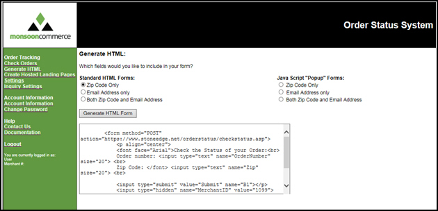 This page displays a generic non-formatted HTML or JavaScript source code that can be copied and pasted for use on your site. Choose which fields (Email, Zip Code or both) should be included along with the order number field and select Generate HTML Form.