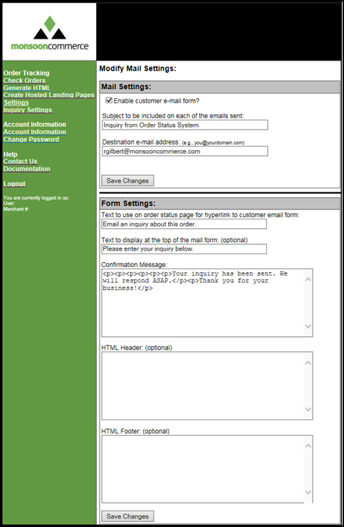 This page gives the retailer control over the e-mail inquiry feature, which allows your customers to send you an e-mail inquiring about an order.