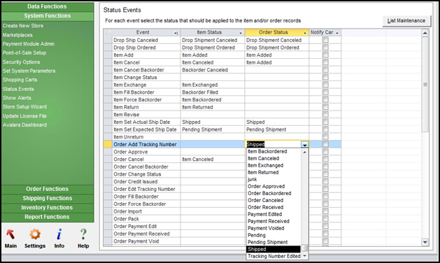 In the example shown in the figure above, the status event Order Add Tracking Number is assigned the status label of Shipped. When an order has new tracking information added to it, the status of the order changes to Shipped when the Status Event is triggered by the Process Tracking Numbers function. For more information about that function, see the Related Topics at the end of this article. If Notify Cart is selected, the program also sends the status update to shopping carts.