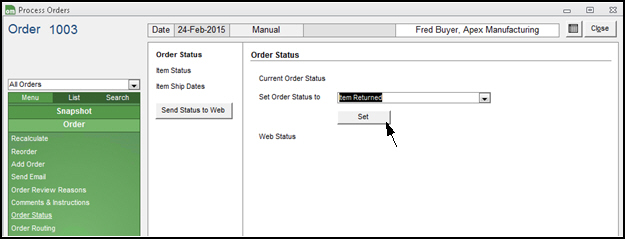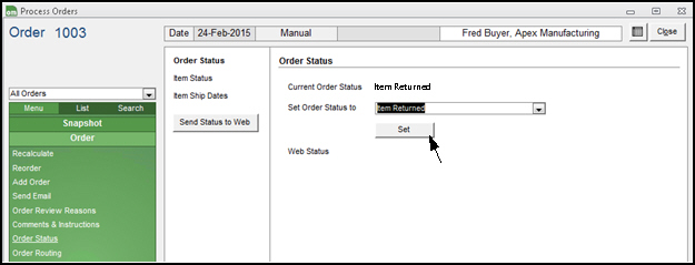 If it becomes necessary to re-send the current status information to the Order Status portal, select Send Status To Web.