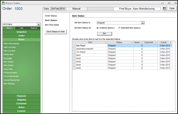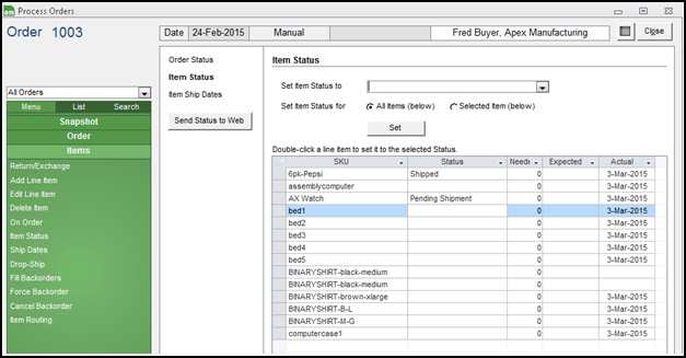 Select a status label from Set Item Status to, or manually type in a status label. Labels added here are unique to the current order and are not added to the status events list used elsewhere in the program.