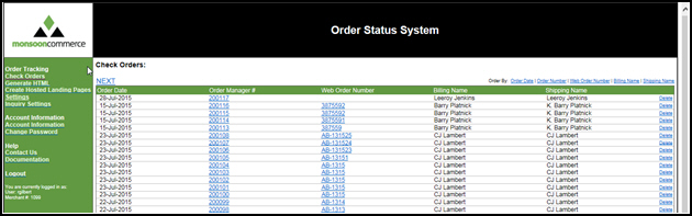 Use this screen to view order status information outside Monsoon OMS. It is possible to sort the list of orders by date, order number, web order number, billing name or shipping name