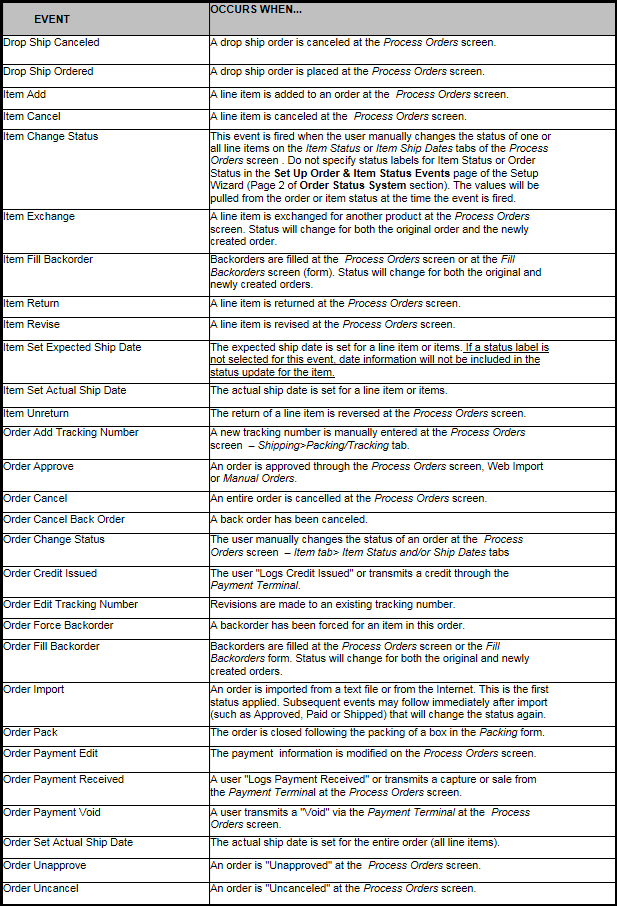 Use the Status Events screen to designate the status label to apply to an order or line item when a given status event occurs. Applying status labels is optional for any given event. If no label is applied to an event then the existing status is not changed.