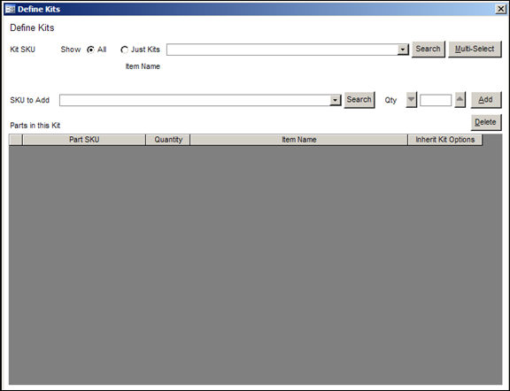Enter or select the product SKU that is to be a component of the kit in the SKU to Add combo box. The Multi-Select button or Search buttons can also be used to locate component inventory records to be entered into the SKU to Add combo box.