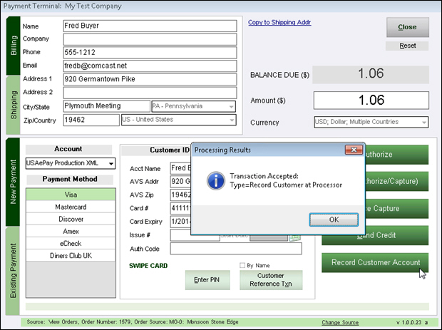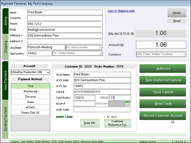 The customer information from the order is pre-populated in the Payment Terminal. If the New Payment tab is not already selected, select it now.