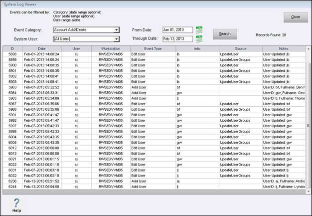 - Make the appropriate selections in any of the filtering controls on the form (Category, User, starting and ending Dates). If no date value is entered, the program assumes the current day.