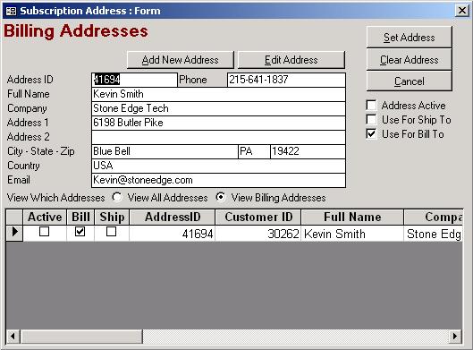 Click in the row that contains the address to which you wish to set as the Ship To or Bill To address and click Set Address. The Billing/Shipping Address dialog box closes.