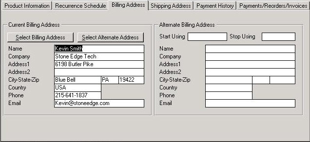 The Billing and Shipping Address tabs store the current addresses for the subscription. You can also specify an alternate billing or shipping address and indicate when the alternative address is in effect. Because the tabs are the same, this document covers both.