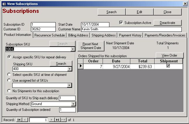 This tab allows you to define whether anything ships and, if so, the SKU that will ship as well as the shipping method used. These settings are copied from the Subscription SKU as defined at the "Configure SKUs" form and works in the same manner.