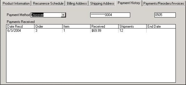 The Payment History tab displays a list of when a customer was billed for a subscription and when payments were applied. If the subscription is shipment-based, the number of shipments for which the customer paid is displayed in the Shipments column. If the subscription is time-based, the appropriate end date is displayed in the End Date column. If both columns are blank, the customer is invoiced per shipment.