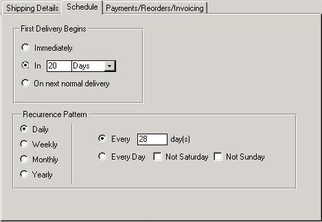 The program sets the subscription's start date to the date the order was placed. When the Order Generation system runs, it creates a shipment for the subscription and sets the "Last Order Date" to the date the system generated the order. The settings you specify in the Recurrence Schedule section go into effect after the first shipment and the program uses the Last Order Date to set the next shipment date.